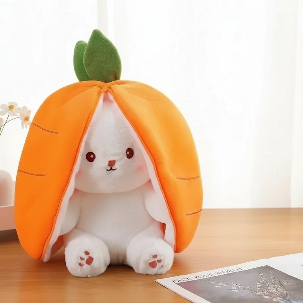 Ce lapin en peluche de 25 cm se cache malicieusement dans une carotte toute douce, pour le plus grand bonheur des petits.