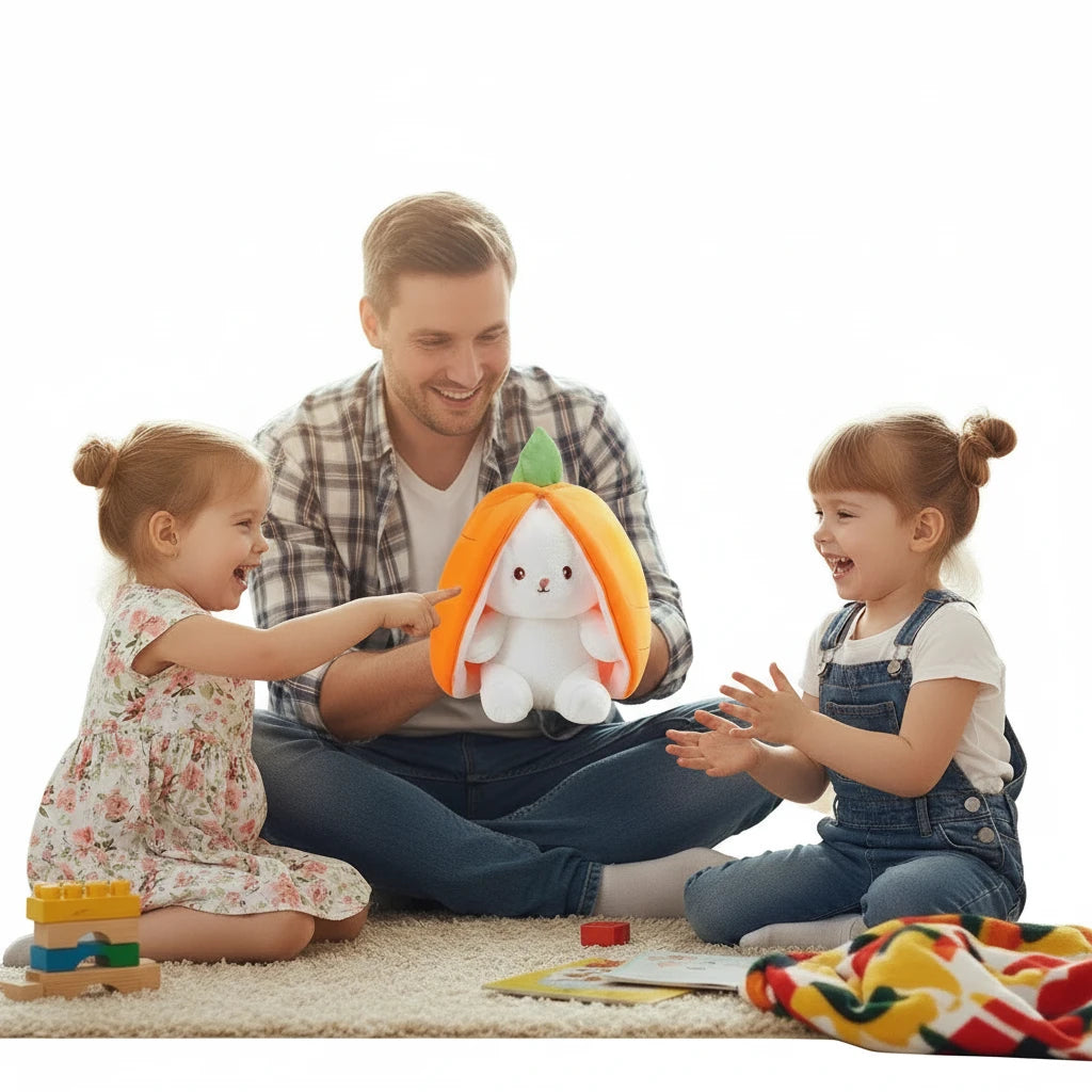 Ce lapin en peluche de 25 cm se cache malicieusement dans une fraise ou une carotte toute douce, pour le plus grand bonheur des petits comme des grands.
